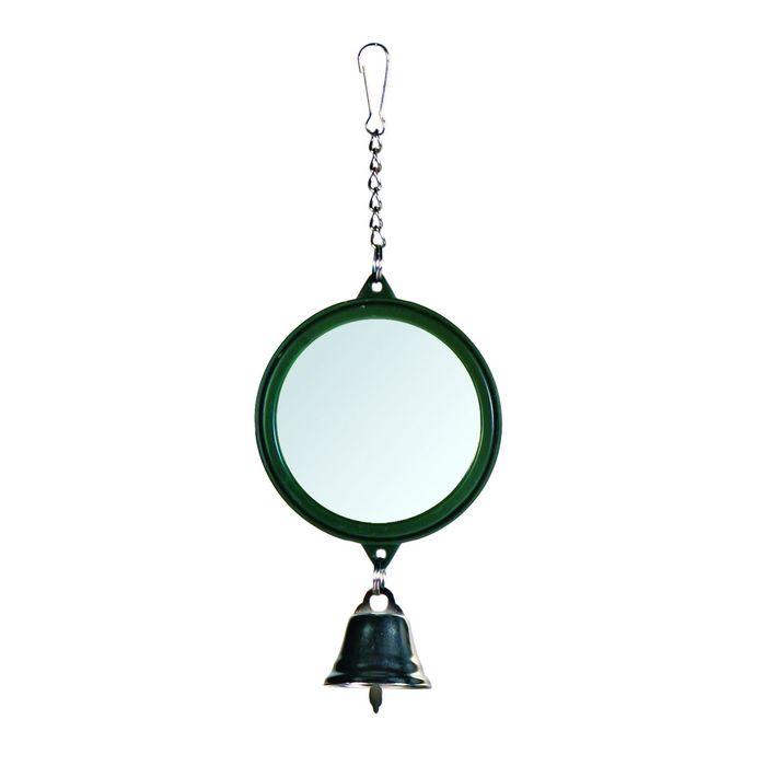 Аксессуар подвешивается в клетке на небольшое колечко, снизу расположена подвеска колокольчик.